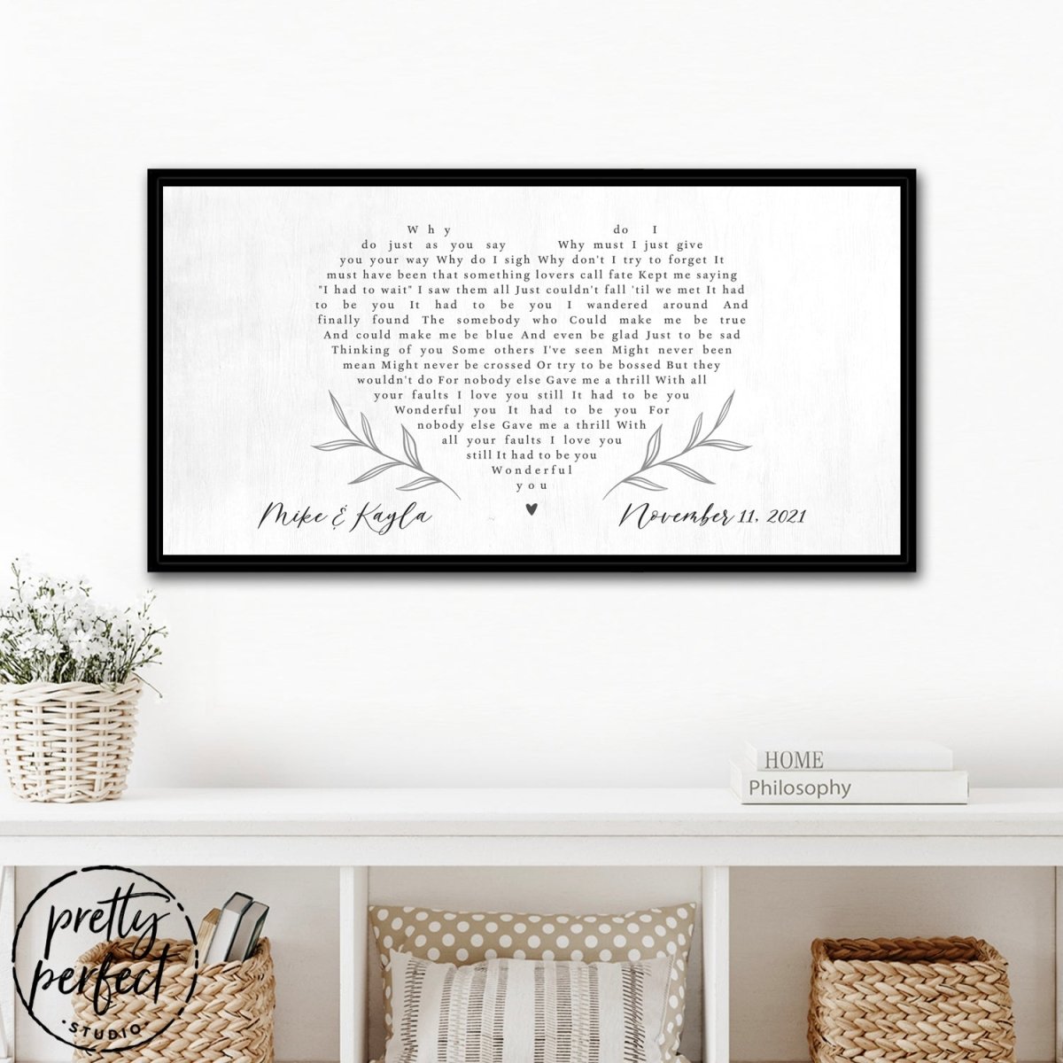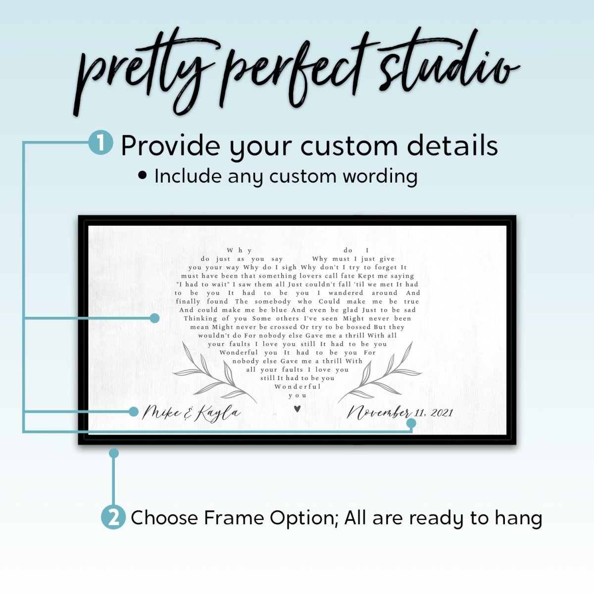Personalize your wedding song lyrics sign on premium quality canvas wall art, professionally designed by Pretty Perfect Studio. Receive your art proof in 24 hours or less! Free Revisions until you're happy with the final design. Â