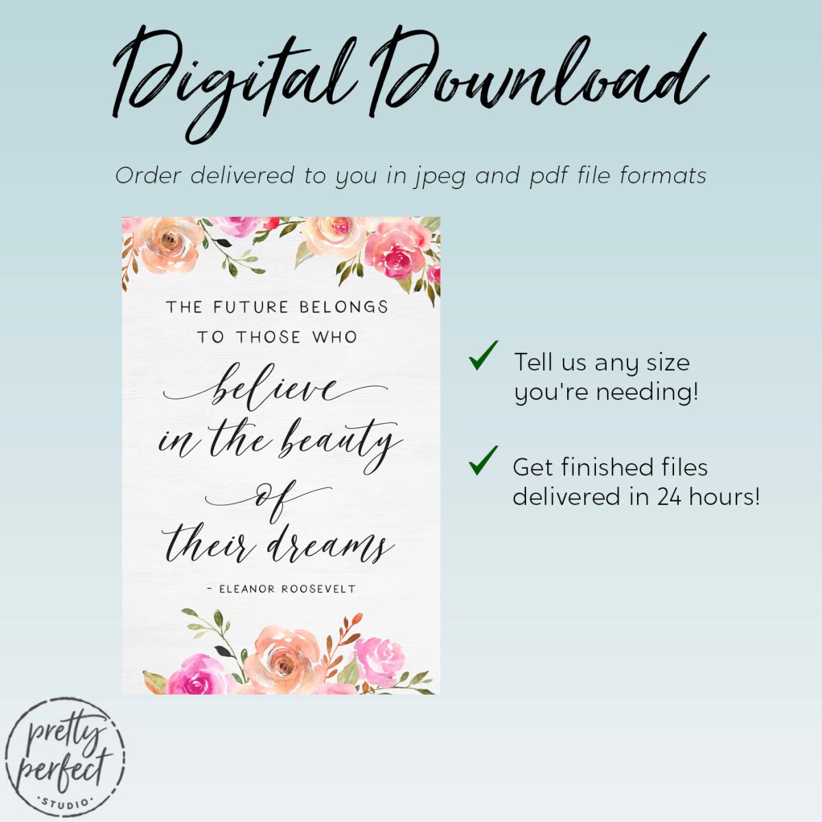 The Future Belongs to Those Who Believe in the Beauty of Their Dreams, a famous quote by Eleanor Roosevelt, is printed on premium heirloom canvas wall art, professionally designed by Pretty Perfect Studio!