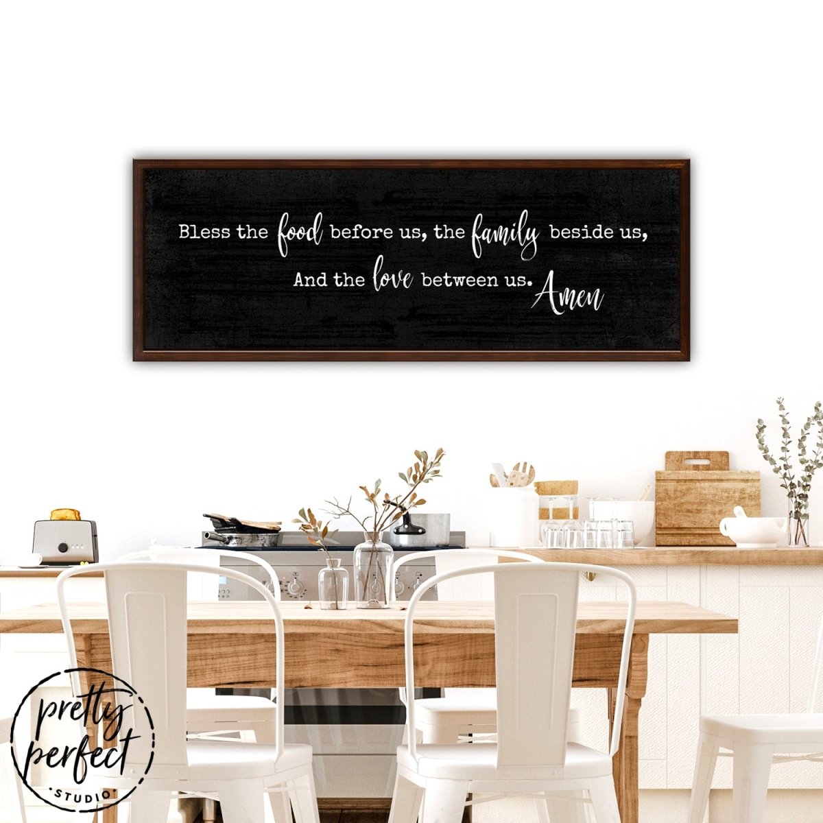 Bless The Food Before Us, The Family Beside Us, And The Love Between Us, Amen. Large table blessing, family signs, make the perfect southern farmhouse country kitchen & dining room canvas wall art decor.