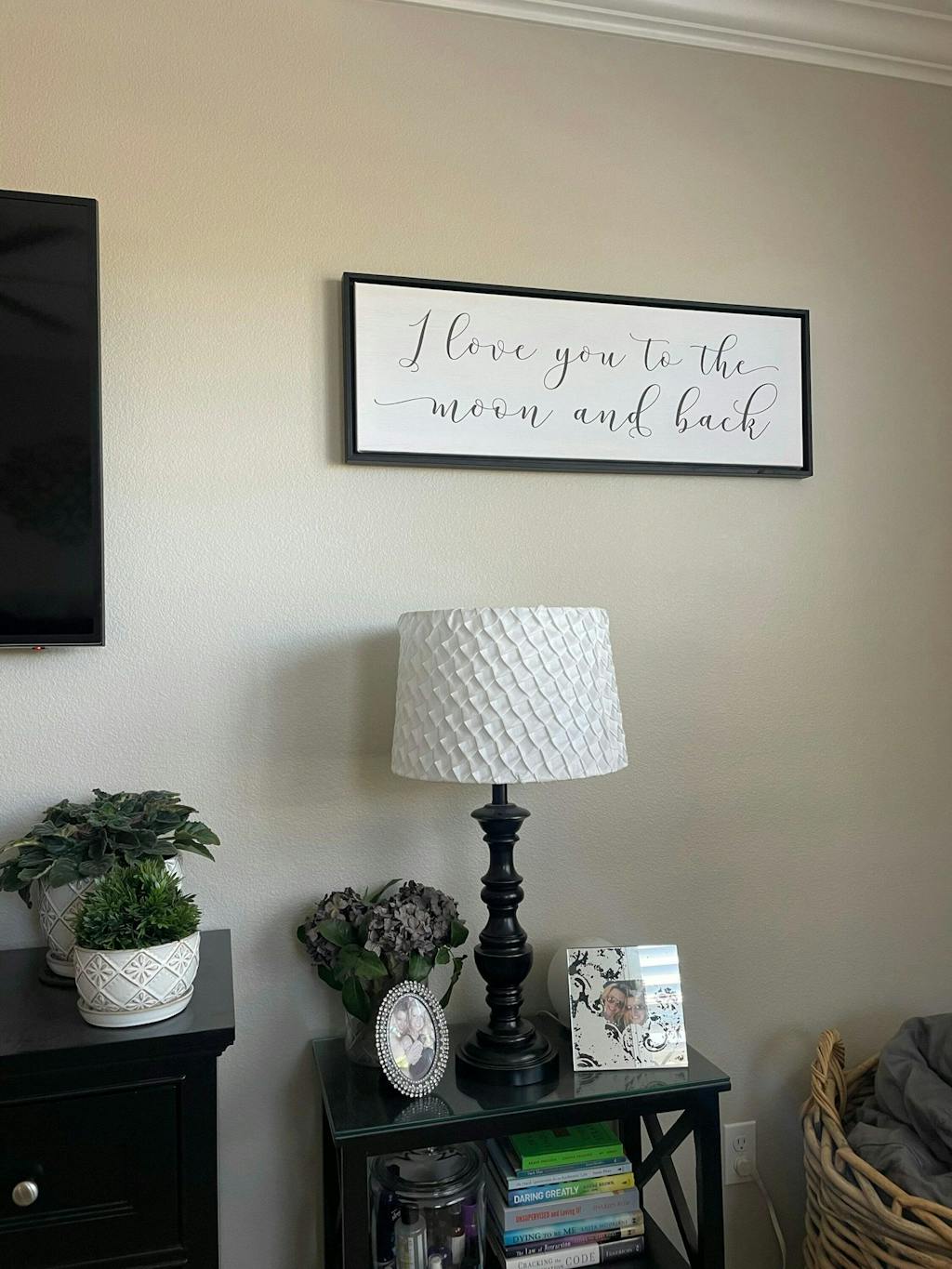 Love You To The Moon And Back Sign is the perfect master bedroom or nursery wall art for your home. This large canvas sign is a great addition above the bed or above the nursery.